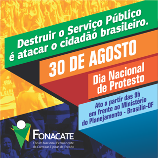 Esta quarta-feira (30), a partir das 9h, é também o Dia Nacional de Protesto. O movimento é organizado pelo Fórum Nacional Permanente de Carreiras Típicas de Estado (Fonacate) e tem adesão total da ANESP e das demais entidades que compõem o Ciclo de Gestão. O ato prevê mobilizações durante todo o dia, com foco no Ministério do Planejamento, Desenvolvimento e Gestão, no Bloco C da Esplanada dos Ministérios, mesmo lugar da reunião com o Secretário Augusto Chiba. Os servidores públicos de todas as categorias e os cidadãos interessados são convidados a participarem dos movimentos que protestam contra o adiamento dos reajustes salariais; os salários iniciais no Executivo de R$ 2,8 mil (nível médio) e R$ 5 mil (nível superior); e a alteração da alíquota de contribuição previdenciária de forma progressiva, para até 14%.
