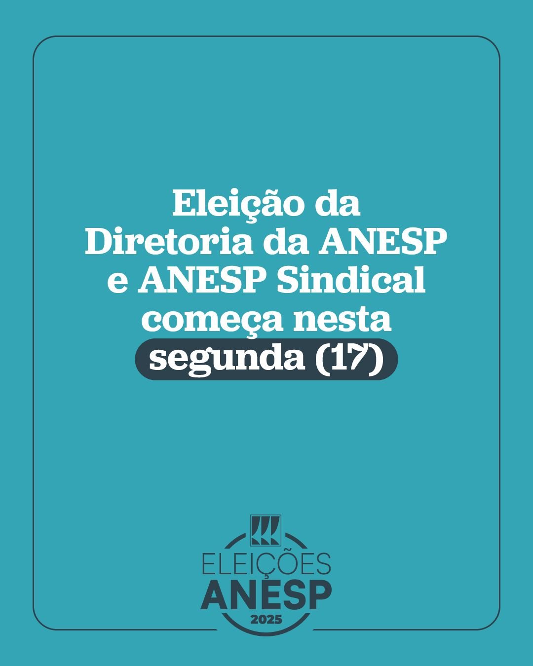Não esqueça: acontece na próxima semana a eleição da Diretoria da ANESP e ANESP Sindical para o biênio 2026-2027, assim como a seleção do Conselho. O formulário de voto será enviado por e-mail às 18h do dia 17/11, segunda-feira, e ficará aberto à participação até as 18h do dia 18/11, terça-feira.