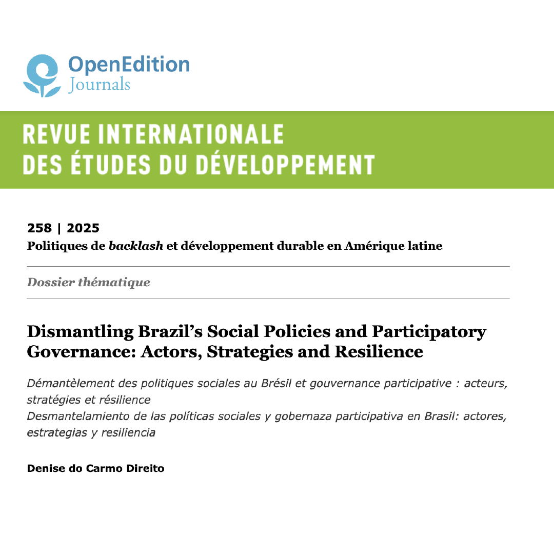 A EPPGG Denise Direito publicou artigo na revista Revue Internationale des Études du Développement a respeito do desmonte dos mecanismos participativos da política de assistência social no Brasil no período de 2015 a 2022. Embora a fase mais aguda da pandemia de covid-19 esteja incluída nesse recorte – o que pressionou as áreas de políticas sociais –, as despesas da assistência social, quando comparados os gastos discricionários de 2016 com os de 2021, registraram queda de 54% no País.