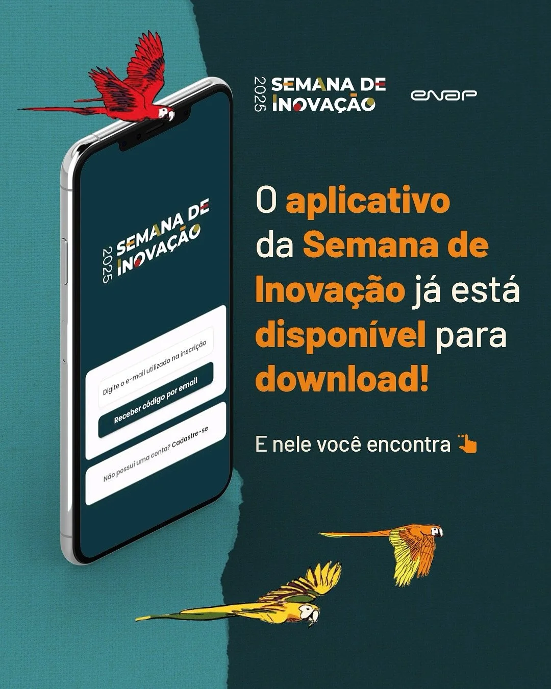 A Enap também está disponibilizando um aplicativo específico para a Semana de Inovação, no qual é possível acompanhar as novidades da programação e, ainda, criar conexões com outros participantes que também estejam usando o dispositivo. O app está disponível para download em dispositivos Android ou iOS. Para que ele funcione corretamente, é necessário cadastrar o mesmo e-mail utilizado para a inscrição.