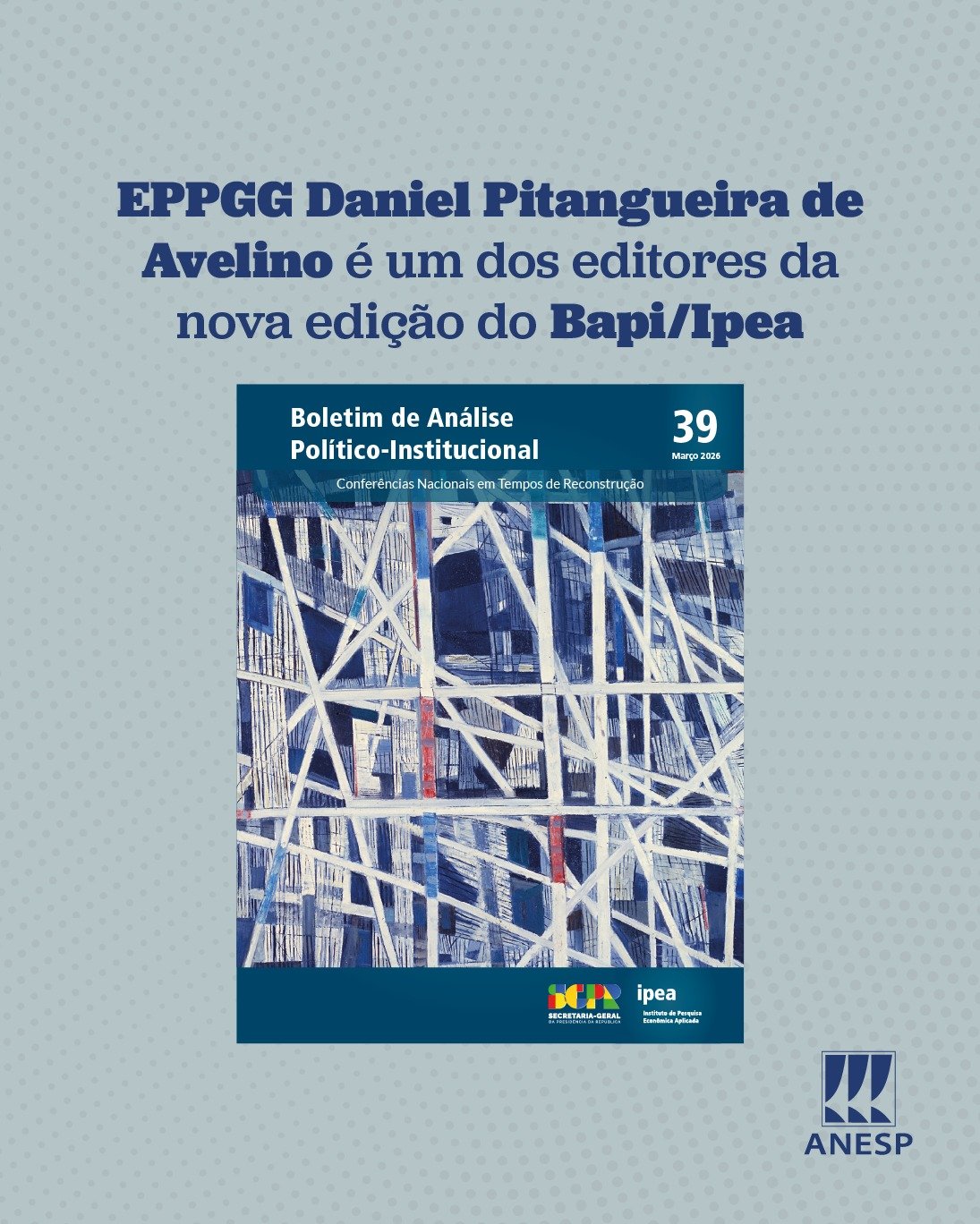 O presidente da ANESP, Daniel Pitangueira de Avelino, é um dos editores – ao lado de Itaquê Santana Barbosa – da nova edição do Boletim de Análise Político-Institucional (Bapi), organizado pela Diretoria de Estudos e Políticas do Estado, das Instituições e da Democracia (Diest) do Instituto de Pesquisa Econômica Aplicada (Ipea). Os estudos reunidos na publicação revelam, a partir de metodologias diversas, que houve um aumento de 250% na realização de conferências nacionais no Brasil entre 2022 e 2024, em comparação com o período 2019-2021. A alta comprova o crescimento e o fortalecimento de espaços de participação social após os impactos da pandemia de covid-19 e atritos entre governo federal e espaços participativos no triênio anterior.