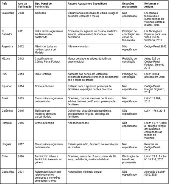 Em relação à tipificação do feminicídio, há mais de 50 normas adotadas para penalizar agressores e criminosos por razões de gênero. A seguir, algumas dessas legislações específicas de países da América Latina sobre o tema.